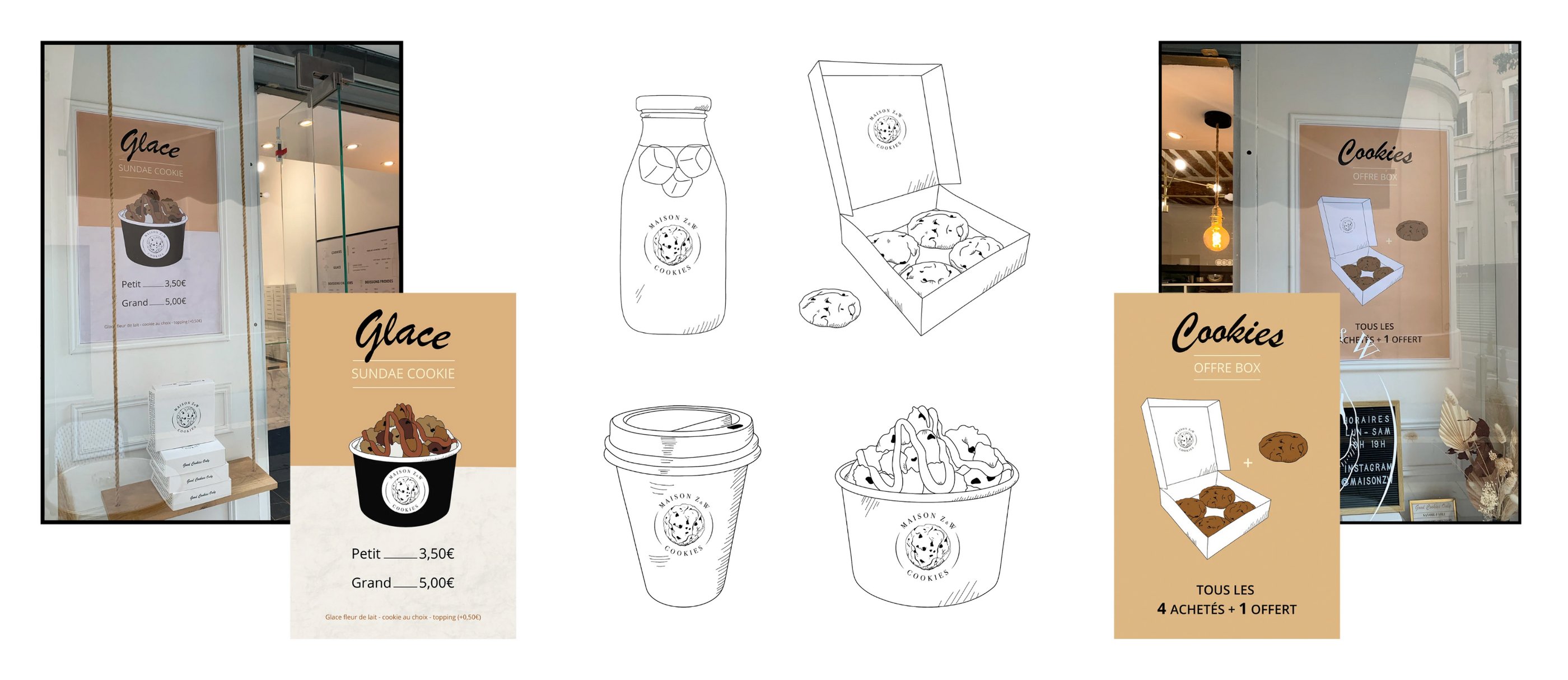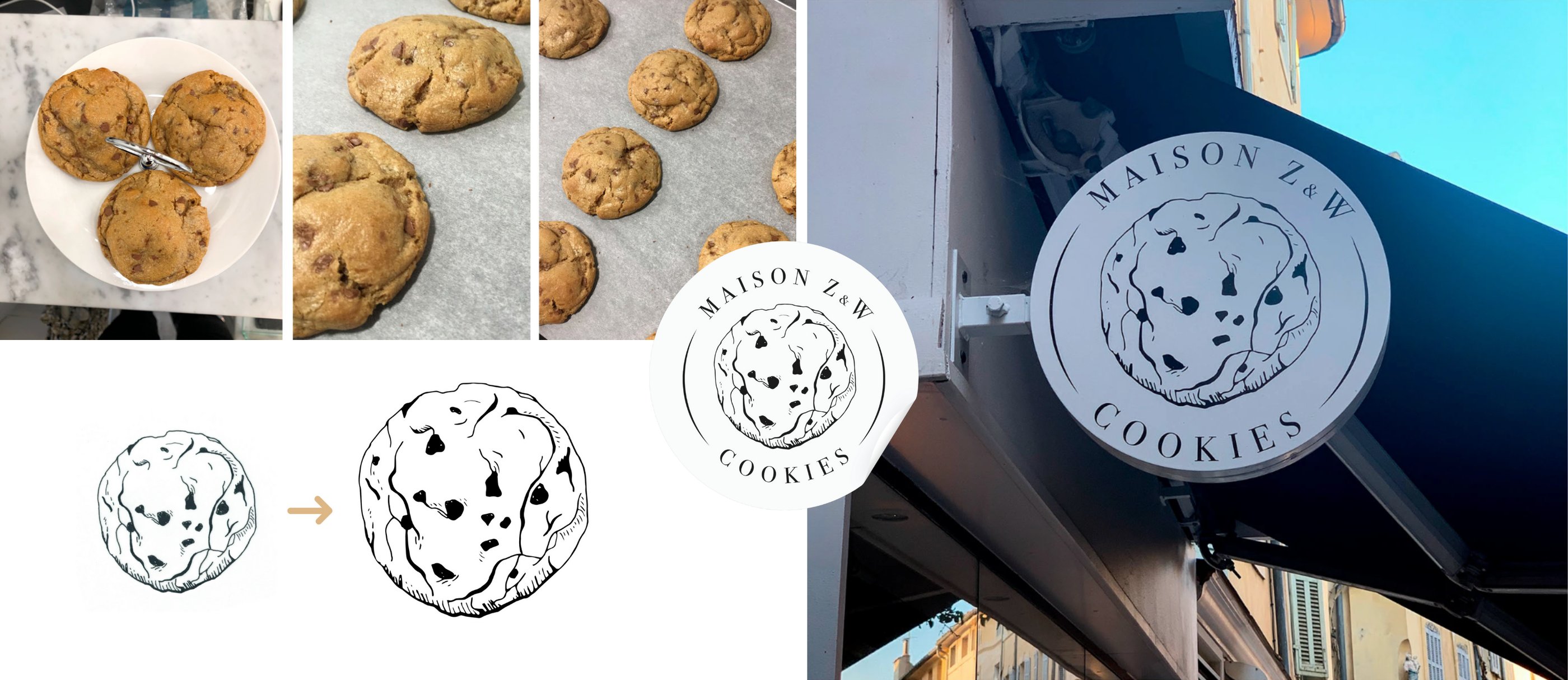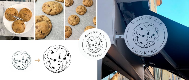 Pour Maison Z&W, j’ai imaginé une identité graphique à la fois moderne, artisanale et gourmande. Le logo, illustré à la main, met en avant l’élément phare de la marque : le cookie. Ce visuel central est entouré d’une typographie élégante, avec une composition circulaire qui évoque à la fois la forme du cookie et l’univers des maisons traditionnelles.